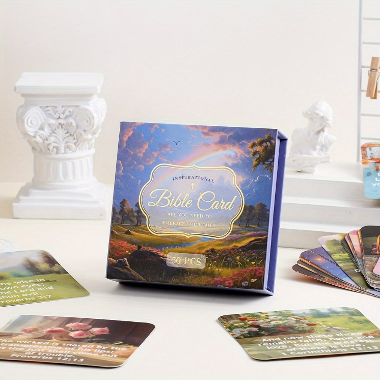 A set of 50 inspirational scripture cards featuring encouraging Bible verses and uplifting messages, perfect for daily devotion, prayer, and sharing faith with others.